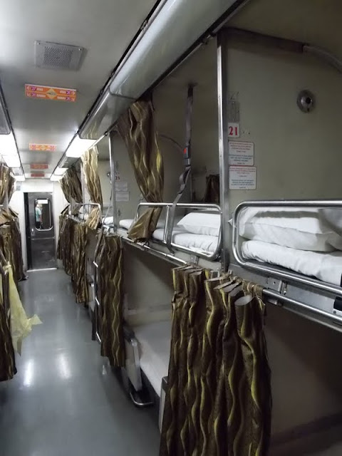 Az éjszakai vonat tiszta volt. Csak két hibájával nem tudtam kibékülni: az egyik a légkondi, a másik, hogy nem volt csomagtartó a táskának. Hosszas ötletelés és táskakötözés után mégis inkább amellett döntöttem, hogy az ágyba teszem a hátizsákot, mint mindenki más. A felső ágy kb 60 cm széles és 170 hosszú. Akárhogy teszem a zsákot, nem fogok elférni. A légkondi meg szokás szerint fagypontra volt állítva. A reakcióm a várakozásokat meghaladva drámai volt. Hiába a meleg ruha, egy óra elteltével már szörcsögtem, aztán meg nem kaptam levegőt, közben a torkom csípett és égett, ha a számon próbáltam lélegezni. Reggelre már súlyos influenzás tüneteket produkáltam (még azóta sem múlt el - jól megfáztam).